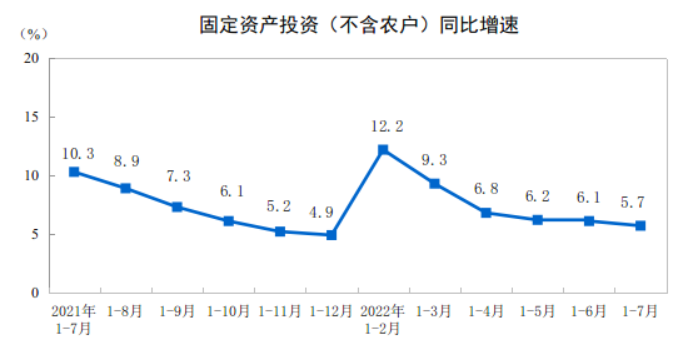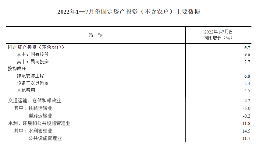 據(jù)國家統(tǒng)計局消息,1—7月份,各地區(qū)各部門高效統(tǒng)籌疫情防控和經(jīng)濟社會發(fā)展,扎實推進穩(wěn)投資系列舉措,加快發(fā)行使用地方政府專項債券,適度超前開展基礎(chǔ)設(shè)施投資,著力推進重大項目建設(shè),盤活存量資產(chǎn)擴大有效投資,全國固定資產(chǎn)投資(不含農(nóng)戶)同比增長5.7%。從環(huán)比看,7月份全國固定資產(chǎn)投資(不含農(nóng)戶)增長0.16%。