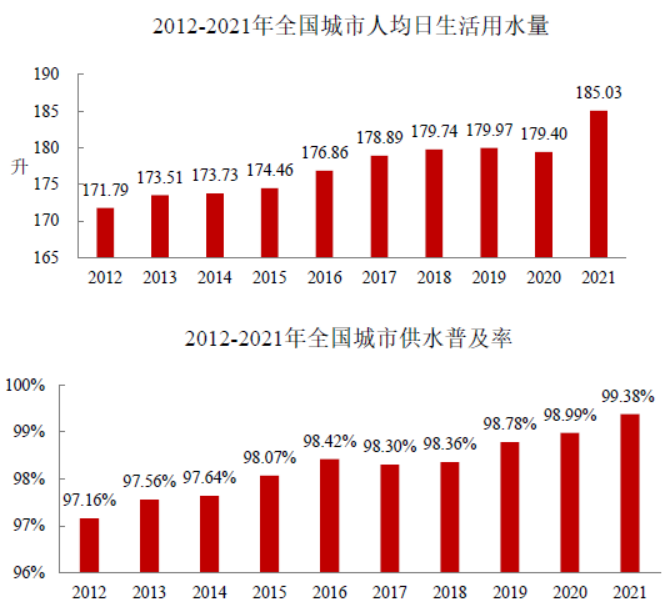 2021年,全國城市供水總量673.34億立方米,同比增長6.96%;城市供水管道長度105.99萬公里,同比增長5.26%;人均日生活用水量185.03升;供水普及率99.38%,比上年增加0.39個百分點。