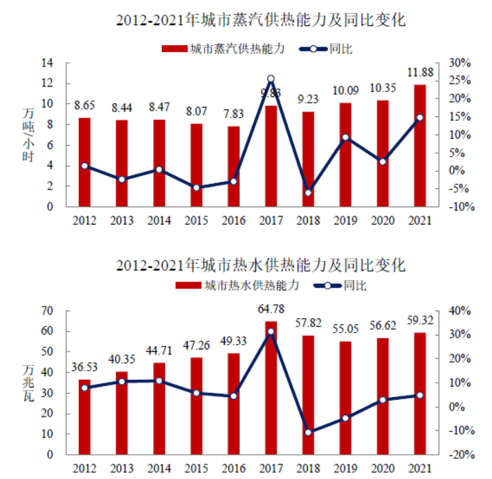 2021 年年末,全國城市蒸汽集中供熱能力 11.88 萬噸/小時,同比增長 14.80%;熱水集中供熱能力 59.32 萬兆瓦,同比增長 4.78%。