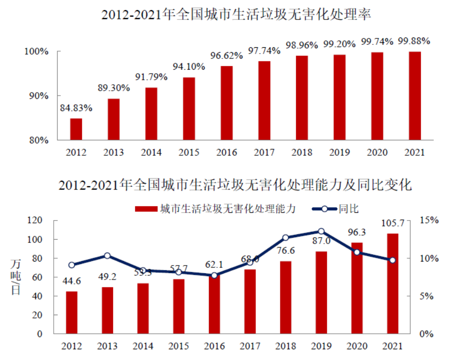 2021年,全國城市生活垃圾無害化處理量2.5億噸,同比增長5.9%;生活垃圾無害化處理率99.88%,比上年增加0.14個百分點;生活垃圾無害化處理能力105.7萬噸/日,同比增長9.7%,其中,焚燒處理能力占比為68.1%。