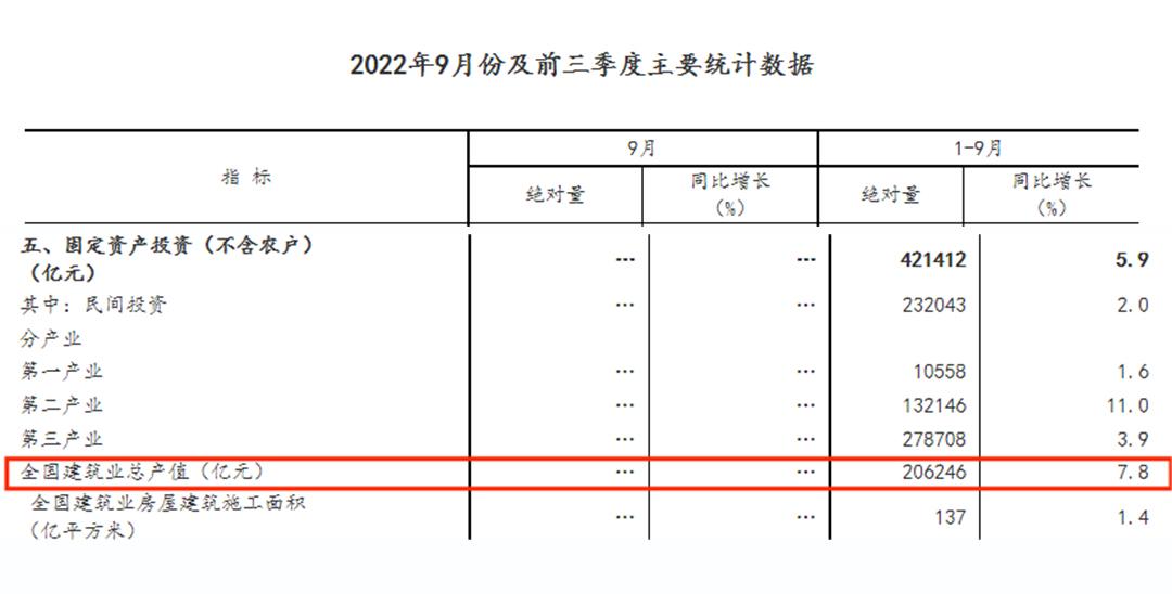 國家統(tǒng)計局10月24日發(fā)布數(shù)據(jù),初步核算,2022年前三季度國內(nèi)生產(chǎn)總值870269億元,按不變價格計算,同比增長3.0%,比上半年加快0.5個百分點。其中,前三季度(1—9月)全國建筑業(yè)總產(chǎn)值206246億元,同比增長7.8%。