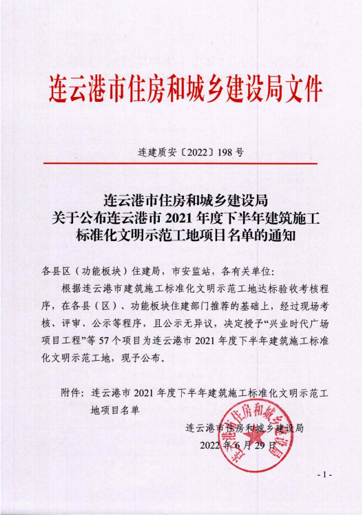 近日,連云港市住房和城鄉(xiāng)建設(shè)局發(fā)布了《連云港市住房和城鄉(xiāng)建設(shè)局關(guān)于公布連云港市2021年度下半年建筑施工標(biāo)準(zhǔn)化文明示范工地項目名單的通知》,我司所承建的連云港徐圩新區(qū)第二水廠及配套管網(wǎng)二期工程廠區(qū)施工總承包項目榮獲“連云港市2021年度下半年建筑施工標(biāo)準(zhǔn)化文明示范工地”稱號。